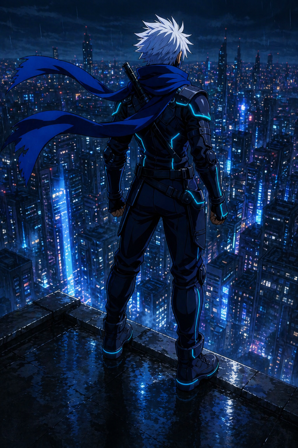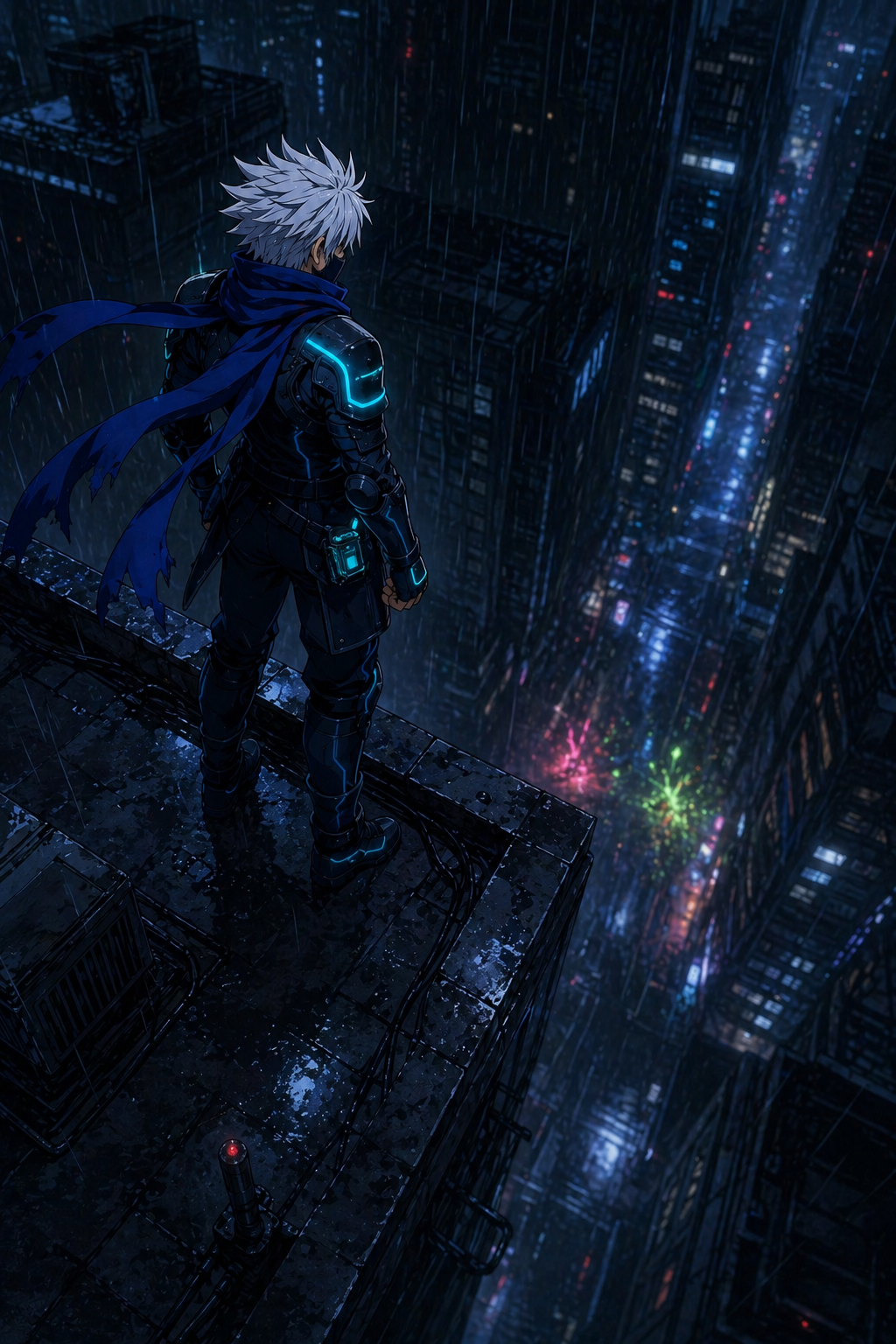 Blue Razz stands at the rooftop edge, back to camera. Dark navy segmented armor with cyan seam glow, navy mask, white-silver spiky mid-neck hair, blue scarf trailing left in rooftop wind. His boots are planted on scuffed concrete; the scuff marks stay under his boots throughout the shot. The city drops away below him: layered rooftops, power lines, steam vents, neon kanji, tiny traffic lights. He does not walk. He does not turn. Only scarf and rain move.