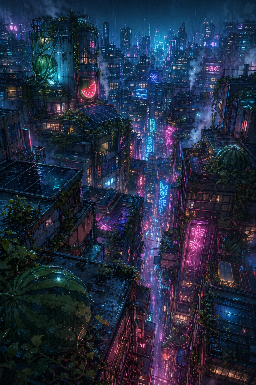 STYLE: Blue Razz world = deep navy + electric cyan above. Fire Watermelon world = pink-coral + lime green below. Keep palettes separated by altitude. Anime cel-shaded. NOT photorealistic. Makoto Shinkai rooftop loneliness + Kyoto Animation hand-detail restraint.