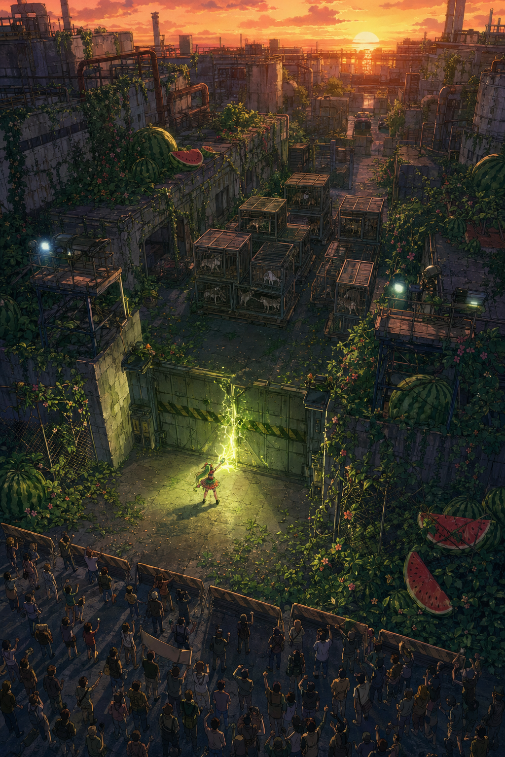 @Image3 DISTANT EVENT: Fire Watermelon far below at an illegal animal facility gate, tiny but readable pink-coral/lime-green, grenade flare opening the gate, animal crates visible, crowd behind barricades. Blue absent.