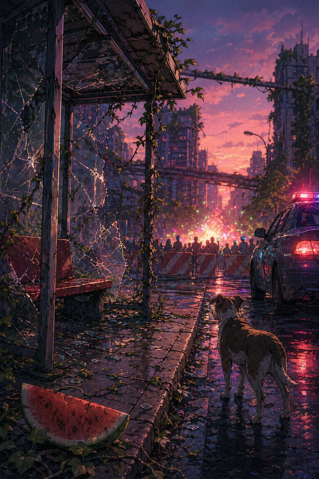@Image4 COLLATERAL: street-level aftermath detail only: cracked bus shelter glass, loose dog near curb, car alarm red-blue lights, barricade and phone screens in background, no Blue, Fire only as distant pink-green glow.