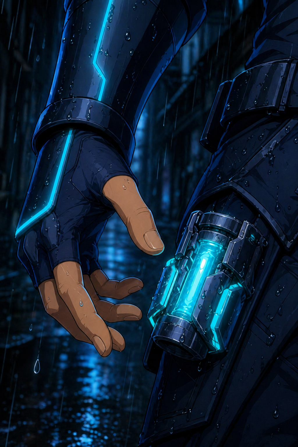 @Image5 HAND DETAIL: Blue Razz right hand hovering two inches from collapsed cyan weapon core at hip, index/middle/ring fingers partially extended, dark navy armor wrist, rain droplets, cyan glow faint. No Fire, no city crowd.
